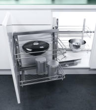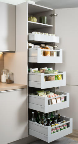magic corners, integrated waste bins, LED lighting and space tower larder units. We can also